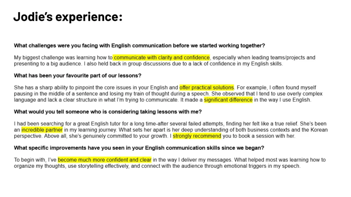 Over the years, I’ve coached executives, team leaders, and professionals from some of the top Korean and international companies to present in English with confidence, fluency, and authority.